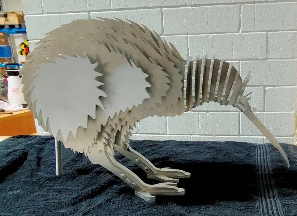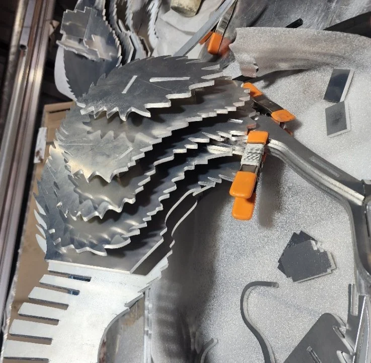 Cutting, preparing, welding (MIG), assembly, polishing letters, polishing birds, cleaning, treating surface